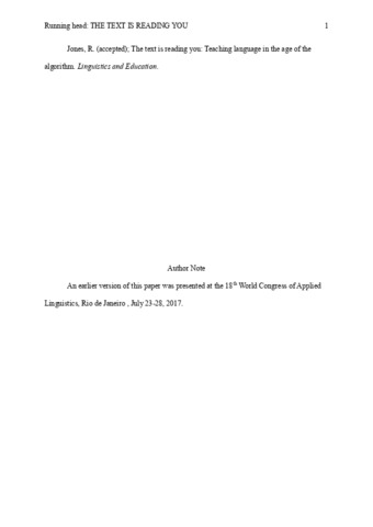 Jones, R. H. orcid id iconORCID: https://orcid.org/0000-0002-9426-727X (2021) The text is reading you: teaching language in the age of the algorithm. Linguistics and Education, 62. 100750. ISSN 0898-5898 doi: 10.1016/j.linged.2019.100750
