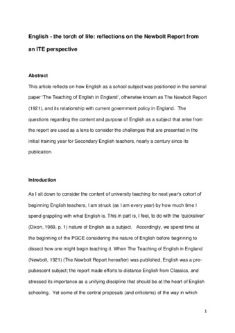 English - the torch of life: reflections on the Newbolt Report from an ITE perspective.