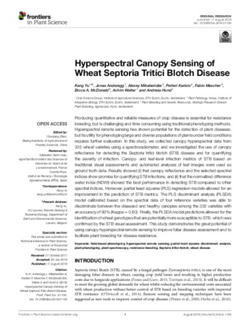 Yu, K., Anderegg, J., Mikaberidze, A., Karisto, P., Mascher, F., McDonald, B. A., Walter, A. and Hund, A. (2018) Hyperspectral canopy sensing of wheat septoria tritici blotch disease. Frontiers in Plant Science, 9. 1195. ISSN 1664-462X doi: 10.3389/fpls.2018.01195