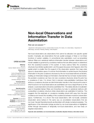 Van Leeuwen, P. J. (2019) Nonlocal observations and information transfer in data assimilation. Frontiers in Applied Mathematics and Statistics, 5. ISSN 2297-4687 doi: 10.3389/fams.2019.00048