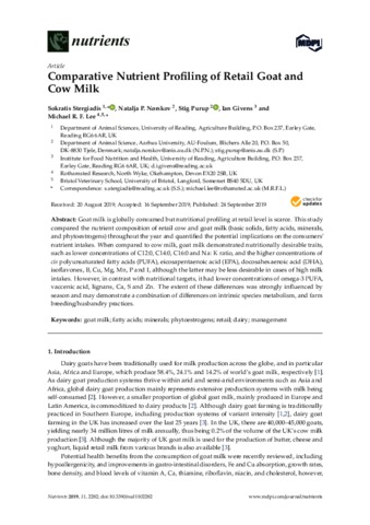 Goat milk is globally consumed but nutritional profiling at retail level is scarce. This study compared the nutrient composition of retail cow and goat milk (basic solids, fatty acids, minerals, and phytoestrogens) throughout the year and quantified the potential implications on the consumers’ nutrient intakes. When compared to cow milk, goat milk demonstrated nutritionally desirable traits, such as lower concentrations of C12:0, C14:0, C16:0 and Na:K ratio, and the higher concentrations of cis PUFA, EPA, DHA, isoflavones, B, Cu, Mg, Mn, P and I; although the latter may be less desirable in cases of high milk intakes. However, in contrast with nutritional targets, it had lower concentrations of omega-3 PUFA, vaccenic acid, lignans, Ca, S and Zn. The extent of these differences was strongly influenced by season and may demonstrate a combination of differences on intrinsic species metabolism, and farm breeding/husbandry practices.