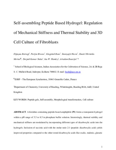 Bairagi, D., Biswas, P., Basu, K., Hazra, S., Hermida-Merino, D., Sinha, D. K., Hamley, I. W. orcid id iconORCID: https://orcid.org/0000-0002-4549-0926 and Banerjee, A. (2019) Self-assembling peptide-based hydrogel: regulation of mechanical stiffness and thermal stability and 3D cell culture of fibroblasts. ACS Applied Bio Materials, 2 (12). pp. 5235-5244. ISSN 2576-6422 doi: 10.1021/acsabm.9b00424