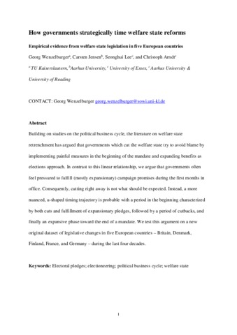 Building on studies on the political business cycle, the literature on welfare state retrenchment has argued that governments which cut the welfare state try to avoid blame by implementing painful measures in the beginning of the mandate and expanding benefits as elections approach. In contrast to this linear relationship, we argue that governments often feel pressured to fulfill (mostly expansionary) campaign promises during the first months in office. Consequently, cutting right away is not what should be expected. Instead, a more nuanced, u-shaped timing trajectory is probable with a period in the beginning characterized by both cuts and fulfillment of expansionary pledges, followed by a period of cutbacks, and finally an expansive phase toward the end of a mandate. We test this argument on a new original dataset of legislative changes in five European countries – Britain, Denmark, Finland, France, and Germany – during the last four decades.
