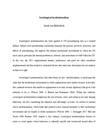 This chapter applies a sociological institutionalist frame to UN peacekeeping and explains the role of norms, rules, and culture in shaping the behaviour of peacekeeping actors. More specifically, sociological institutionalism focuses on actors as social agents whose behaviour is culturally specific and constructed around ideas of appropriateness; we can thus better understanding not only why UN peacekeeping takes the form that it does but also how and why it changes over time through an examination of the internal institutional environment of the UN and the self-images and values of UN staff. These dynamics are illustrated empirically with a discussion of local ownership in UN peacekeeping that demonstrates how UN staff engage in inefficient or contradictory behaviours because of their need to perceive that their actions are appropriate and legitimate and to remain aligned with their own institutional standards.