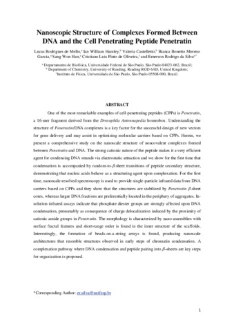 One of the most remarkable examples of cell-penetrating peptides (CPPs) is Penetratin, a 16-mer fragment derived from the Drosophila Antennapedia homeobox. Understanding the structure of Penetratin/DNA complexes is a key factor for the successful design of new vectors for gene delivery and may assist in optimizing molecular carriers based on CPPs. Herein, we present a comprehensive study on the nanoscale structure of noncovalent complexes formed between Penetratin and DNA. The strong cationic nature of the peptide makes it a very efficient agent for condensing DNA strands via electrostatic attraction, and we show for the first time that DNA condensation is accompanied by random-to-β-sheet transitions of Penetratin secondary structure, demonstrating that nucleic acids behave as a structuring agent upon complexation. For the first time, nanoscale-resolved spectroscopy is used to provide single-particle infrared data from DNA carriers based on CPPs, and they show that the structures are stabilized by Penetratin β-sheet cores, whereas larger DNA fractions are preferentially located in the periphery of aggregates. In-solution infrared assays indicate that phosphate diester groups are strongly affected upon DNA condensation, presumably as a consequence of charge delocalization induced by the proximity of cationic amide groups in Penetratin. The morphology is characterized by nanoassemblies with surface fractal features, and short-range order is found in the inner structure of the scaffolds. Interestingly, the formation of beads-on-a-string arrays is found, producing nanoscale architectures that resemble structures observed in early steps of chromatin condensation. A complexation pathway where DNA condensation and peptide pairing into β-sheets are key steps for organization is proposed.