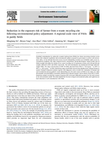 He, M., Yang, S., Zhao, J., Collins, C., Xu, J. and Liu, X. (2019) Reduction in the exposure risk of farmer from e-waste recycling site following environmental policy adjustment: a regional scale view of PAHs in paddy fields. Environment international, 133 (Part A). 105136. ISSN 1873-6750 doi: 10.1016/j.envint.2019.105136