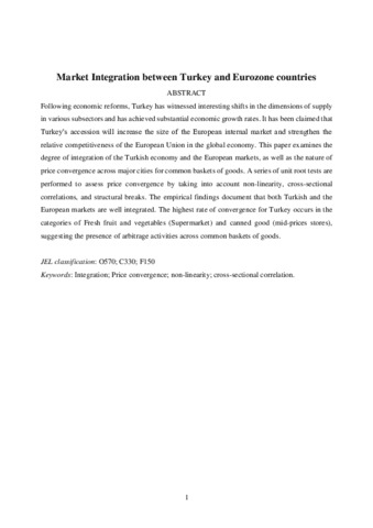This study examines the degree of integration of the Turkish economy and European markets as well as the nature of price convergences across major cities for common categories of goods. A series of unit root tests are performed to assess these price convergences by considering non-linearity, cross-sectional correlations, and structural breaks. We find that the Turkish and European markets are well-integrated. Moreover, Turkey’s highest rate of convergence occurs in the fresh fruits and vegetables (supermarkets) and canned goods (mid-priced stores) categories, suggesting arbitrage activities exist across common categories of goods.