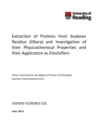 Eze, O. F. (2019) Extraction of proteins from soybean residue (okara) and investigation of their physicochemical properties and their application as emulsifiers. PhD thesis, University of Reading. doi: 10.48683/1926.00086374