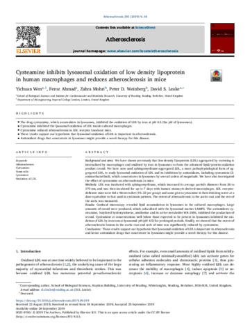 Cysteamine inhibits lysosomal oxidation of low density lipoprotein in human macrophages and reduces atherosclerosis in mice.