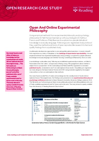 Francis, K., Hansen, N. orcid id iconORCID: https://orcid.org/0000-0001-5074-1075 and Beaman, P. orcid id iconORCID: https://orcid.org/0000-0001-5124-242X, (2019) Open and online experimental philosophy. Open Research Case Studies. Report. University of Reading