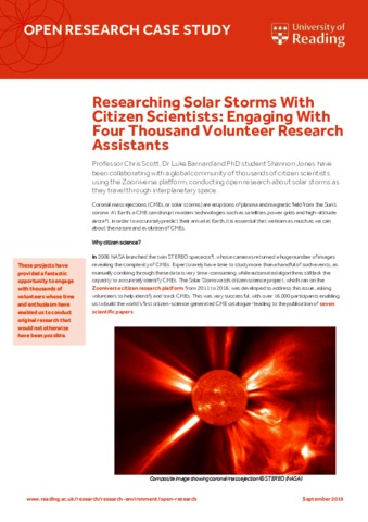 Jones, S., Scott, C. orcid id iconORCID: https://orcid.org/0000-0001-6411-5649 and Barnard, L. orcid id iconORCID: https://orcid.org/0000-0001-9876-4612, (2019) Researching solar storms with citizen scientists: engaging with four thousand volunteer research assistants. Open Research Case Studies. Report. University of Reading