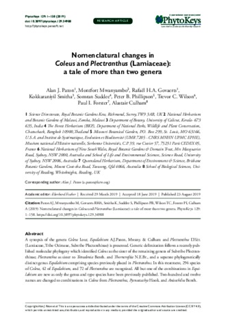 Paton A, Mwanyambo M, Culham A (2018) Phylogenetic study of Plectranthus, Coleus and allies (Lamiaceae): Taxonomy, distribution and medicinal use. Botanical Journal of the Linnean Society 188(4): 355–376. https://doi.org/10.1093/botlinnean/boy064