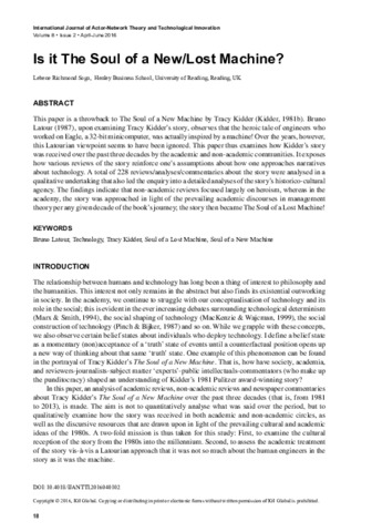 Soga, L. R. orcid id iconORCID: https://orcid.org/0000-0002-5471-9673 (2016) Is it the soul of a new/lost machine? International Journal of Actor-Network Theory and Technological Innovation, 8 (2). pp. 18-31. ISSN 1942-535X doi: 10.4018/IJANTTI.2016040102