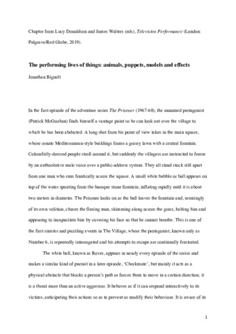 This chapter addresses how critical analysis might describe and evaluate non-human “performances” in television fiction, and how they affect distinctions between actor and role, and between character and narrative function. Across the history and genres of television, there have been very many “objects” that narratives make expressive but that are not human, nor even, in some cases, alive at all. The chapter considers the balloon-like Rovers of "The Prisoner" TV series, the kangaroos in "Skippy", and the puppets and models in "Thunderbirds", arguing that if they are to play their part in the fictional world, each of these things needs to function as an expressive “performer”. It argues that the boundaries between self and other, human and non-human, are thus destabilised and reflect on the work of creation in television.
