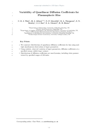 Watt, C., Allison, H., Meredith, N., Thompson, R., Bentley, S., Rae, I. J., Glauert, S. and Horne, R. (2019) Variability of quasilinear diffusion coefficients for plasmaspheric hiss. Journal of Geophysical Research: Space Physics, 124 (11). pp. 8488-8506. ISSN 2169-9402 doi: 10.1029/2018JA026401