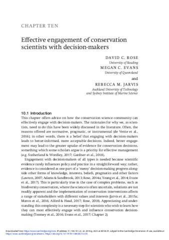 Rose, D. C., Evans, M. C. and Jarvis, R. M. (2020) Effective engagement of conservation scientists with decision-makers. In: Sutherland, W. J., Brotherton, P. N. M., Davies, Z. G., Ockendon, N., Pettorelli, N. and Vickery, J. A. (eds.) Conservation Research, Policy and Practice. Ecological reviews. Cambridge University Press, Cambridge, UK, pp. 162-182. ISBN 9781108714587 doi: 10.1017/9781108638210.010