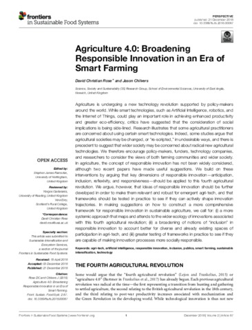 Rose, D. C. and Chilvers, J. (2018) Agriculture 4.0: broadening responsible innovation in an era of smart farming. Frontiers in Sustainable Food Systems, 2. 87. ISSN 2571-581X doi: 10.3389/fsufs.2018.00087