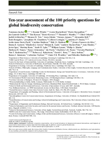 Jucker, T., Wintle, B., Shackelford, G., Bocquillon, P., Geffert, J. L., Kasaor, T., Kovacs, E., Mumby, H. S., Orland, C., Schleicher, J., Tew, E. R., Zabala, A., Amano, T., Bell, A., Bongalov, B., Chambers, J. M., Garnett, E. E., Green, E. J., Guth, M. K., Hacket-Pain, A., Hinsley, A., Igea, J., Kunz, M., Luke, S. H., Martin, P. A., Lynam, W., Nunes, M. H., Ockendon, N., Pavitt, A., Payne, C. L. R., Plutshack, V., Rademacher, T. T., Robertson, R. J., Rose, D. C., Serban, A., Simmons, B. I., Corrigan, C., Emilson, E. J. S., Tayleur, C., Wordley, C. F. R., Mukherjee, N., Durán, A. P., Duvic-Paoli, L.-A., Emilson, C., Emilson, E. J. S. and Fonseca da Silva, J. (2018) Ten-year assessment of the 100 priority questions for global biodiversity conservation. Conservation Biology, 32 (6). pp. 1457-1463. ISSN 0888-8892 doi: 10.1111/cobi.13159