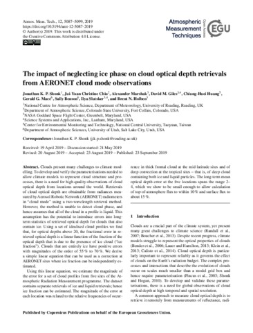 Shonk, J. K. P., Chiu, J. Y. C., Marshak, A., Giles, D. M., Huang, C.-H., Mace, G. G., Benson, S., Slutsker, I. and Holben, B. N. (2019) The impact of neglecting ice phase on cloud optical depth retrievals from AERONET cloud mode observations. Atmospheric Measurement Techniques, 12 (9). pp. 5087-5099. ISSN 1867-8548 doi: 10.5194/amt-12-5087-2019