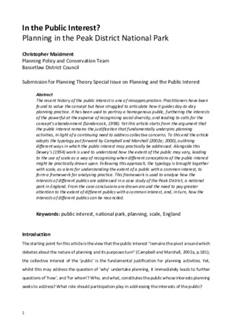 The recent history of the public interest is one of misappropriation. Practitioners have been found to value the concept but have struggled to articulate how it guides day-to-day planning practice. It has been used to portray a homogenous public, furthering the interests of the powerful at the expense of recognising social diversity, and leading to calls for the concept’s abandonment (Sandercock, 1998). Yet this article starts from the argument that the public interest remains the justification that fundamentally underpins planning activities, in light of a continuing need to address collective concerns. To this end the article adopts the typology put forward by Campbell and Marshall (2002a; 2000), outlining different ways in which the public interest may practically be addressed. Alongside this Dewey’s (1954) work is used to understand how the extent of the public may vary, leading to the use of scale as a way of recognising when different conceptions of the public interest might be practically drawn upon. Following this approach, the typology is brought together with scale, as a lens for understanding the extent of a public with a common interest, to form a framework for analysing practice. This framework is used to analyse how the interests of different publics are addressed in a case study of the Peak District, a national park in England. From the case conclusions are drawn around the need to pay greater attention to the extent of different publics with a common interest, and, in turn, how the interests of different publics can be reconciled.