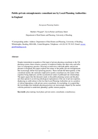 Wargent, M. orcid id iconORCID: https://orcid.org/0000-0002-1448-9383, Parker, G. orcid id iconORCID: https://orcid.org/0000-0003-3079-4377 and Street, E. orcid id iconORCID: https://orcid.org/0000-0002-8987-5916 (2019) Public-private entanglements: consultant use by local planning authorities in England. European Planning Studies, 28 (1). pp. 192-210. ISSN 1469-5944 doi: 10.1080/09654313.2019.1677565