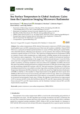 Pearson, K., Good, S., Merchant, C. J. orcid id iconORCID: https://orcid.org/0000-0003-4687-9850, Prigent, C., Embury, O. orcid id iconORCID: https://orcid.org/0000-0002-1661-7828 and Donlon, C. (2019) Sea surface temperature in global analyses: gains from the copernicus imaging microwave radiometer. Remote Sensing, 11 (20). 2362. ISSN 2072-4292 doi: 10.3390/rs11202362