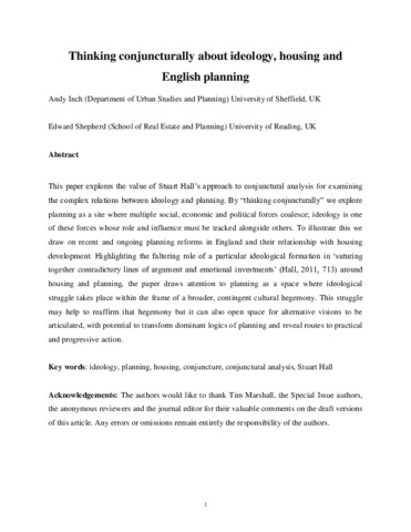 Inch, A. and Shepherd, E. (2020) Thinking conjuncturally about ideology, housing and English planning. Planning Theory, 19 (1). pp. 59-79. ISSN 1741-3052 doi: 10.1177/1473095219887771