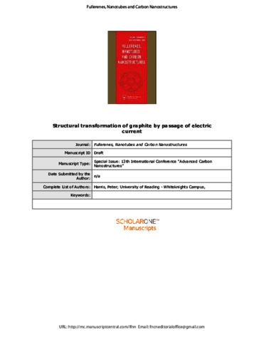 Harris, P. J. F. (2020) Structural transformation of graphite by passage of electric current. Fullerenes, Nanotubes and Carbon Nanostructures, 28 (1). pp. 66-70. ISSN 1536-4046 doi: 10.1080/1536383x.2019.1671368