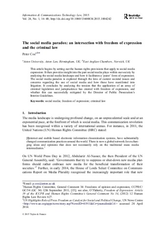 Coe, P. orcid id iconORCID: https://orcid.org/0000-0002-6036-4127 (2015) The social media paradox: an intersection with freedom of expression and the criminal law. Information and Communications Technology Law, 24 (1). pp. 16-40. ISSN 1360-0834 doi: 10.1080/13600834.2015.1004242