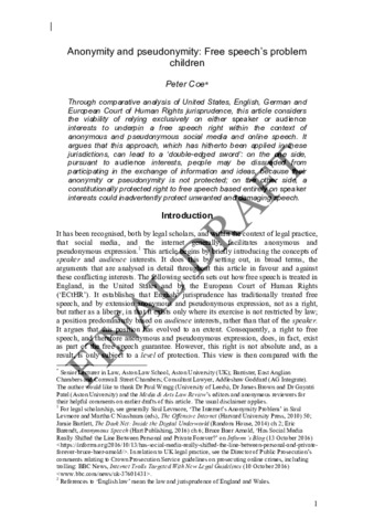 Through comparative analysis of US, English, German and European Court of Human Rights jurisprudence, this article considers the viability of relying exclusively on either speaker or audience interests to underpin a free speech right within the context of anonymous and pseudonymous social media and online speech. It argues that this approach, which has hitherto been applied in these jurisdictions, can lead to a ‘double-edged sword’: on the one side, pursuant to audience interests, people may be dissuaded from participating in the exchange of information and ideas, because their anonymity or pseudonymity is not protected; on the other side, a constitutionally protected right to free speech based entirely on speaker interests could inadvertently protect unwanted and damaging speech.