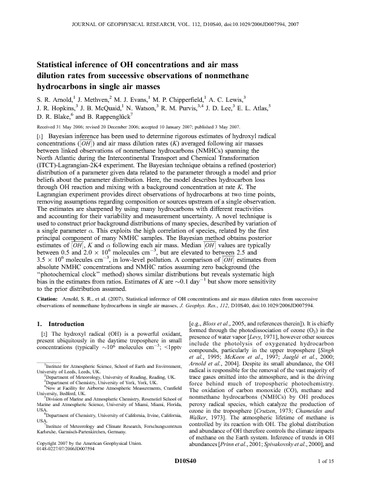 Bayesian inference has been used to determine rigorous estimates of hydroxyl radical concentrations () and air mass dilution rates (K) averaged following air masses between linked observations of nonmethane hydrocarbons (NMHCs) spanning the North Atlantic during the Intercontinental Transport and Chemical Transformation (ITCT)-Lagrangian-2K4 experiment. The Bayesian technique obtains a refined (posterior) distribution of a parameter given data related to the parameter through a model and prior beliefs about the parameter distribution. Here, the model describes hydrocarbon loss through OH reaction and mixing with a background concentration at rate K. The Lagrangian experiment provides direct observations of hydrocarbons at two time points, removing assumptions regarding composition or sources upstream of a single observation. The estimates are sharpened by using many hydrocarbons with different reactivities and accounting for their variability and measurement uncertainty. A novel technique is used to construct prior background distributions of many species, described by variation of a single parameter . This exploits the high correlation of species, related by the first principal component of many NMHC samples. The Bayesian method obtains posterior estimates of , K and following each air mass. Median values are typically between 0.5 and 2.0 × 106 molecules cm−3, but are elevated to between 2.5 and 3.5 × 106 molecules cm−3, in low-level pollution. A comparison of estimates from absolute NMHC concentrations and NMHC ratios assuming zero background (the “photochemical clock” method) shows similar distributions but reveals systematic high bias in the estimates from ratios. Estimates of K are ∼0.1 day−1 but show more sensitivity to the prior distribution assumed.