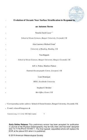 Lucas, N. S., Grant, A. L. M., Rippeth, T. P., Polton, J. A., Palmer, M. R., Brannigan, L. and Belcher, S. E. (2019) Evolution of oceanic near surface stratification in response to an autumn storm. Journal of Physical Oceanography, 49 (11). pp. 2961-2978. ISSN 1520-0485 doi: 10.1175/jpo-d-19-0007.1
