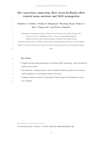 Demott, C. A., Klingaman, N. orcid id iconORCID: https://orcid.org/0000-0002-2927-9303, Tseng, W.-L., Burt, M. A., Gao, Y. and Randall, D. A. (2019) The convection connection: how ocean feedbacks affect tropical mean moisture and MJO propagation. Journal of Geophysical Research, 124 (22). pp. 11910-11931. ISSN 0148-0227 doi: 10.1029/2019JD031015