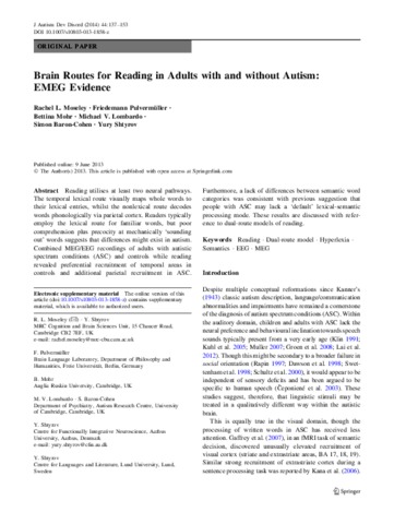 Moseley, R. L., Pulvermüller, F., Mohr, B., Lombardo, M. V., Baron-Cohen, S. and Shtyrov, Y. (2014) Brain routes for reading in adults with and without autism: EMEG evidence. Journal of Autism and Developmental Disorders, 44 (1). pp. 137-153. ISSN 0162-3257 doi: 10.1007/s10803-013-1858-z