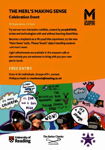 Celebration and launch of purpleSTARS virtual reality (VR) interactive experiences. Modern Shepherd Quad Bike experience and English Forest four seasons experience. Interactive sensor sheep and horse & cart sounds. The interactive exhibits were commissioned from purpleSTARS by the MERL and funded by the Earley Charity.