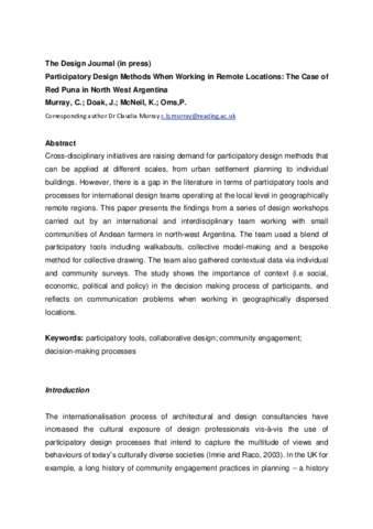Murray, C., Doak, J., McNeil, K. and Oms, P. (2020) Participatory design methods when working in remote locations: The case of Red Puna in north west Argentina. The Design Journal, 23 (2). pp. 1-24. ISSN 1460-6925 doi: 10.1080/14606925.2020.1726663