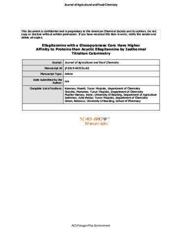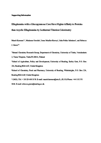 Karonen, M., Oraviita, M., Mueller-Harvey, I., Salminen, J.-P. and Green, R. J. (2019) Ellagitannins with a glucopyranose core have higher affinity to proteins than acyclic ellagitannins by isothermal titration calorimetry. Journal of Agricultural and Food Chemistry, 67 (46). pp. 12730-12740. ISSN 0021-8561 doi: 10.1021/acs.jafc.9b04353