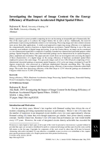 Raval, R. K. and Badii, A. (2019) Investigating the impact of image content on the energy efficiency of hardware-accelerated digital spatial filters. ACM Transactions on Design Automation of Electronic Systems, 24 (5). 57. ISSN 1557-7309 doi: 10.1145/3341819