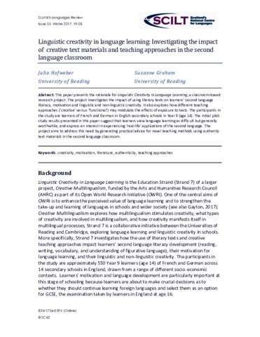 This paper presents the rationale for Linguistic Creativity in Language Learning, a classroom-based research project. The project investigates the impact of using literary texts on learners’ second language literacy, motivation and linguistic and non-linguistic creativity. It also explores how different teaching approaches (‘creative’ versus ‘functional’) may modulate the effects of exposure to texts. The participants in the study are learners of French and German in English secondary schools in Year 9 (age 14). The initial pilot study results presented in this paper suggest that learners view language learning as difficult but generally worthwhile, and express an interest in experiencing ‘real-life’ applications of the second language. The project aims to address this need by generating pra