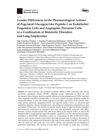 Pershina, O. V., Pakhomova, A. V., Widera, D. orcid id iconORCID: https://orcid.org/0000-0003-1686-130X, Ermakova, N. N., Epanchintsev, A. A., Pan, E. S., Krupin, V. A., Vaizova, O. E., Putrova, O. D., Sandrikina, L. A., Kurochkina, I. V., Morozov, S. G., Kubatiev, A. A., Dygai, A. M. and Skurikhin, E. G. (2019) Gender differences in the pharmacological actions of pegylated glucagon-Like peptide-1 on endothelial progenitor cells and angiogenic precursor cells in a combination of metabolic disorders and lung emphysema. International Journal of Molecular Sciences, 20 (21). 5414. ISSN 1422-0067 doi: 10.3390/ijms20215414