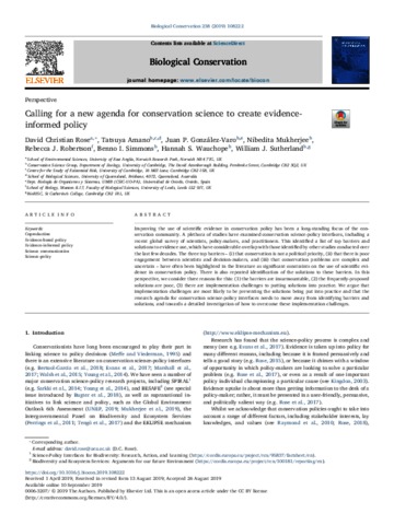 Rose, D. C., Amano, T., González-Varo, J. P., Mukherjee, N., Robertson, R. J., Simmons, B. I., Wauchope, H. S. and Sutherland, W. J. (2019) Calling for a new agenda for conservation science to create evidence-informed policy. Biological Conservation, 238. 108222. ISSN 0006-3207 doi: 10.1016/j.biocon.2019.108222