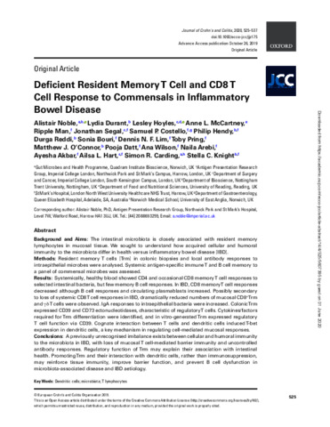 Noble, A., Durant, L., Hoyles, L., McCartney, A. L., Man, R., Segal, J., Costello, S. P., Hendy, P., Reddi, D., Bouri, S., Lim, D. N. F., Pring, T., O’Connor, M. J., Datt, P., Wilson, A., Arebi, N., Akbar, A., Hart, A. L., Carding, S. R. and Knight, S. C. (2020) Deficient resident memory T-cell and Cd8 T-cell response to commensals in inflammatory bowel disease. Journal of Crohn's and Colitis, 14 (4). pp. 525-537. ISSN 1876-4479 doi: 10.1093/ecco-jcc/jjz175