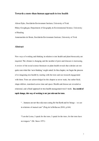 New ways of working and thinking in relation to tree health and plant biosecurity are required. The climate is changing and the number of pests and diseases is increasing. A review of the social science literature on plant health reveals that scholars are not quite sure what this ‘new thinking’ might entail. In this chapter, we begin the process of re-imagining tree health by starting with the trees and our research engagement with them. Trees are acknowledged in this chapter as never static, but rather fluid, shape-shifters, translated across time and space. Health and disease are revealed as relational, and a fixed approach to tree health management won’t work. In a world of rapid change, this way of working is not just relevant for trees.
