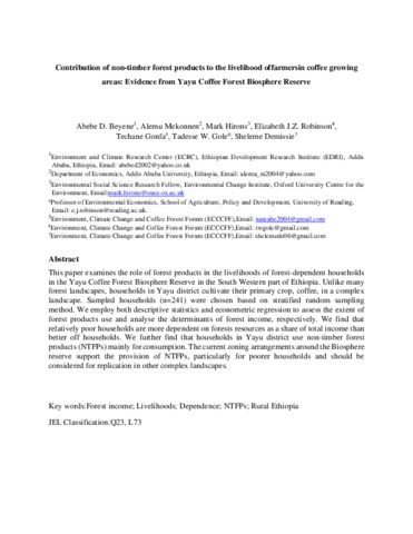 This article examines the role of forest products in the livelihoods of forestdependent households in the Yayu Coffee Forest Biosphere Reserve in the South Western part of Ethiopia. Unlike many forest landscapes, households in Yayu district cultivate their primary crop, coffee, in a complex landscape. Sampled households (n¼241) were chosen based on the stratified random sampling method. We employ both descriptive statistics and econometric regression to assess the extent of forest product use and analyse the determinants of forest income, respectively. We find that relatively poor households are more dependent on forest resources as a share of total income than better-off households. We further find that households in the Yayu district use non-timber forest products (NTFPs) mainly for consumption. The current zoning arrangements around the biosphere reserve support the provision of NTFPs, particularly for poorer households and should be considered for replication in other complex landscapes.