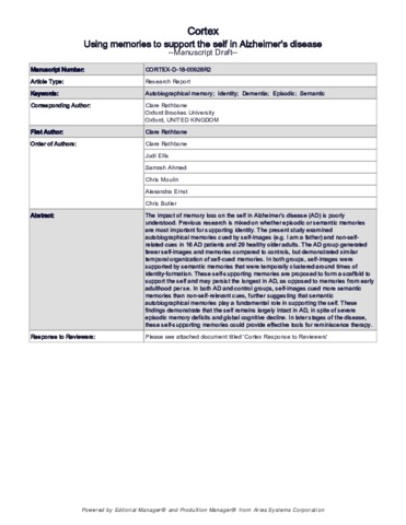 Rathbone, C. J., Ellis, J. A., Ahmed, S., Moulin, C. J. A., Ernst, A. and Butler, C. R. (2019) Using memories to support the self in Alzheimer's disease. Cortex, 121. pp. 332-346. ISSN 1973-8102 doi: 10.1016/j.cortex.2019.09.007