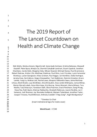 Watts, N., Amann, M., Arnell, N. ORCID: https://orcid.org/0000-0003-2691-4436, Ayeb-Karlsson, S., Belesova, K., Boykoff, M., Byass, P., Cai, W., Campbell-Lendrum, D., Capstick, S., Chambers, J., Dalin, C., Daly, M., Dasandi, N., Davies, M., Drummond, P., Dubrow, R., Ebi, K. L., Eckelman, M., Ekins, P., Escobar, L. E., Fernandez Montoya, L., Georgeson, L., Graham, H., Haggar, P., Hamilton, I., Hartinger, S., Hess, J., Kelman, I., Kiesewetter, G., Kjellstrom, T., Kniveton, D., Lemke, B., Liu, Y., Lott, M., Lowe, R., Sewe, M. O., Martinez-Urtaza, J., Maslin, M., McAllister, L., McGushin, A., Jankin Mikhaylov, S., Milner, J., Moradi-Lakeh, M., Morrissey, K., Murray, K., Munzert, S., Nilsson, M., Neville, T., Oreszczyn, T., Owfi, F., Pearman, O., Pencheon, D., Phung, D., Pye, S., Quinn, R., Rabbaniha, M., Robinson, E.