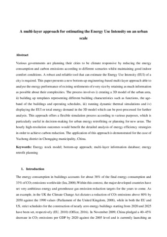 Various governments are planning their cities to be climate responsive by reducing the energy consumption and carbon emissions according to different scenarios whilst maintaining good indoor comfort conditions. A robust and reliable tool that can estimate the Energy Use Intensity (EUI) of a city is required. This paper presents a new bottom-up engineering-based multi-layer approach able to analyse the energy performance of existing settlements of every size by retaining as much information as possible about their complexities. The process involves i) creating a 3D model of the urban area, ii) building up templates representing different building characteristics such as functions, the age-band of the buildings and operating schedules, iii) running dynamic thermal simulations and iv) displaying the EUI or total energy demand in the 3D model which can be post-processed for further analysis. This approach offers a flexible simulation process according to various purposes, which is particularly useful in decision-making for urban energy retrofitting or planning for new areas. The hourly high-resolution outcomes would benefit the detailed analysis of energy efficiency strategies in order to achieve carbon reduction. The application of this approach is demonstrated for the case of Yuzhong district in Chongqing municipality, China.