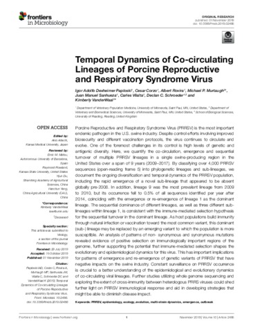 Paploski, I. A. D., Corzo, C., Rovira, A., Murtaugh, M. P., Sanhueza, J. M., Vilalta, C., Schroeder, D. C. and VanderWaal, K. (2019) Temporal dynamics of co-circulating lineages of porcine reproductive and respiratory syndrome virus. Frontiers in Microbiology, 10. 2486. ISSN 1664-302X doi: 10.3389/fmicb.2019.02486