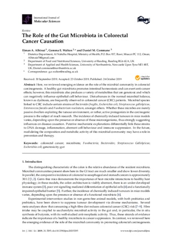 Here, we reviewed emerging evidence on the role of the microbial community in colorectal carcinogenesis. A healthy gut microbiota promotes intestinal homeostasis and can exert anti-cancer effects; however, this microbiota also produces a variety of metabolites that are genotoxic and which can negatively influence epithelial cell behaviour. Disturbances in the normal microbial balance, known as dysbiosis, are frequently observed in colorectal cancer (CRC) patients. Microbial species linked to CRC include certain strains of , and amongst others. Whether these microbes are merely passive dwellers exploiting the tumour environment, or rather, active protagonists in the carcinogenic process is the subject of much research. The incidence of chemically-induced tumours in mice models varies, depending upon the presence or absence of these microorganisms, thus strongly suggesting influences on disease causation. Putative mechanistic explanations differentially link these strains to DNA damage, inflammation, aberrant cell behaviour and immune suppression. In the future, modulating the composition and metabolic activity of this microbial community may have a role in prevention and therapy.