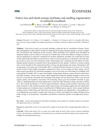 Oaks are currently declining worldwide due to a multitude of threats. Woodland management is often heavily focused on thinning and burning non-target species to reduce competition and promote oak dominance in the overstory. These techniques have typically been developed in temperate regions, such as eastern USA forests, but whether they are the most effective strategy for promoting oak regeneration in semiarid woodlands has not been sufficiently examined. We conducted our study on the eastern Edwards Plateau in central Texas, where several oak species are codominant with Ashe juniper over karst limestone terrane. These juniper-oak woodlands provide habitat for many endemic species and play an essential role in the maintenance of key aquifers. A history of canopy clearing and a severe drought in 2011 generated patches of living and dead juniper-oak canopy interspersed with canopy gaps in our study area. In November 2013, we planted 200 shin oak acorns in each of three habitat treatments, replicated six times: i) live canopy, ii) dead canopy, iii) open invasive grassland. We monitored emergence and survival each year, harvesting five seedlings from each replicate in October 2017 to assess shoot height, rooting depth, biomass, ectomycorrhizal colonization, and foliar nutrients. Canopy trees, living or dead, significantly enhanced seedling emergence and survival. Survival was positively associated with increasing Ashe juniper and oak basal area, shrub cover, and soil organic matter, and negatively associated with increasing canopy gap size (complete mortality in gaps >220 m2). Seedling biomass increased significantly in dead and open treatments along with foliar nutrients N, P and S (dead treatments) or S and Fe (open treatments), whereas ectomycorrhizal colonization and foliar nutrients Ca, Mg, and Mn increased under living canopy. Our findings suggest that oak regeneration in these juniper-oak woodlands closely resembles that of Mediterranean regions, where canopy facilitates seedling survival. Both living and dead trees and shrubs enhanced oak regeneration, with seedling survival depending on proximity to larger trees, living roots, shrubs, and juniper-oak canopy. Planting acorns under canopy is an inexpensive, sustainable, and effective restoration practice in drought-prone ecosystems.